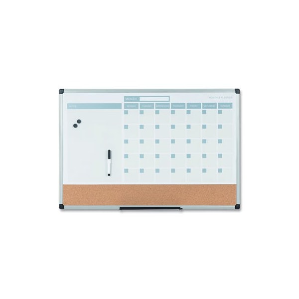 Functionality times three. This dry-erase calendar planner provides space for lists and a bulletin board surface for important cards and notes. Designed to fit in smaller spaces, MasterVision personal home and office products can be used in any working context, boosting performance either in individual or team work. Board Type: Combination, Bulletin/Magnetic Dry Erase Calendar; Board Width: 24in; Board Height: 18in; Surface Material: Cork; Enameled Steel.