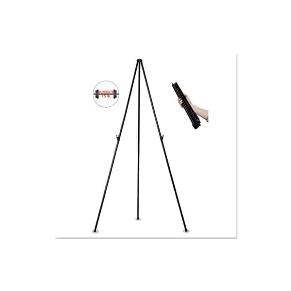 Convenient instant easel is easily portable, lightweight and instantly collapsible. Easy to set up, and fold conveniently for storage and transport. Easel collapses easily to fit into a briefcase or carry bag. Easy to use adjustable board holders and non-skid feet. Durable steel construction. Great for holding signs or poster boards. Heavy-Duty. Easel Type: Folding Display; Maximum Easel Height: 61.5in; Folded Size: 3 x 3.75 x 24.25; Materials: Plastic; Rubber; Steel.