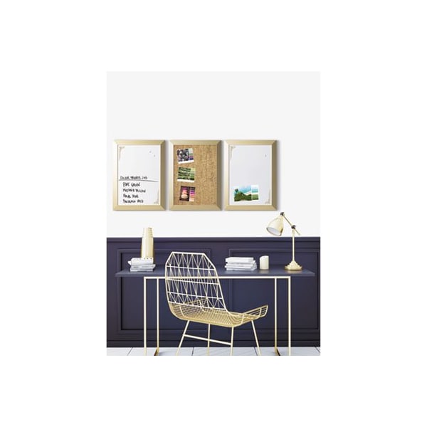 Positive Flow Message Board Sets are a brilliant combination -- keep reminders, deadlines, messages and notes in sight and give your space a unique touch of elegant charm. Stylish, elegant frames intensify each board's eye-catching appeal, making them suitable for any decor. Easy to hang and maintain, each set also includes all accessories: dry erase markers, board erasers, magnets, push pins and wall fixing kits. Metallic Gold SetIncludes two 18 x 24 white magnetic dry erase boards and one 18 x 24 decorative natural/white checkered cork bulletin board. Board Type: Combination Set, Bulletin/Magnetic Dry Erase; Board Width: 18in; Board Height: 24in; Surface Material: Assorted.