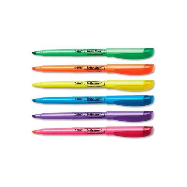 Bic brite liner highlighter, chisel tip, assorted fluorescent ink, 12/box multipurpose pocket style highlighter features a chisel tip for marking wide and narrow lines of text. Compatible with photocopies and computer paper. Non-toxic, pocket clip, odorless & quick-drying ink.
