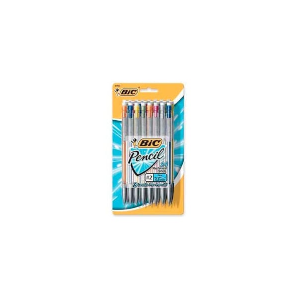 Bic mechanical pencil, pocket clip, 0.5mm, assorted barrels, 24/pack mechanical pencils deliver a write-out equivalent to 2-1/2 wood-case pencils. Smooth writing lead does not smudge, erasing cleanly. Each pencil contains three full-length, self-feeding leads. Convenient pocket clip attaches to pockets and folders. Non-refillable. Pocket clip. larger quantity quotes available. Please call 1-888-978-7759. this product arrives to most customers in 2-3 business days.
