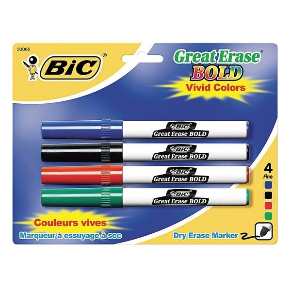 Dry Erase Markers, Bullet, Marker Cap Capped, Barrel Type Pen Style, Low Odor No, Marker Ink Color Assorted, Marker Set Ink Colors Black, Blue, Green, Red, Number of Markers 4, Package Quantity 4
