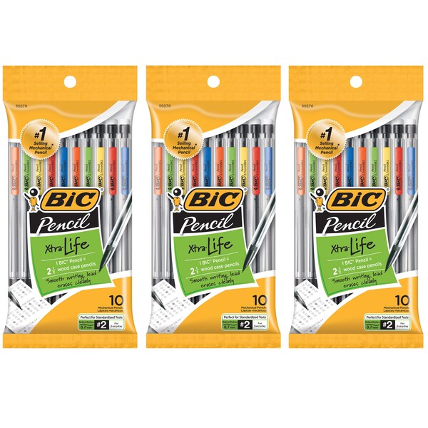 Enjoy smooth writing with the durable BIC Xtra-Life Mechanical Pencil. One BIC pencil equals 2.5 wood case pencils, offering performance and value. With a fresh 0.7mm point only a click away, this #2 pencil is perfect for standardized tests and eliminates the need to sharpen constantly, ensuring you're always ready to write, draw, sketch, or doodle. The smooth-writing lead does not smudge and erases cleanly. The clear barrel is accented with a colorful clip, making it easy to attach the pencil to notebooks and binders, and each pencil comes with three #2 leads. Each pack includes 10 pencils. Sold as a set of 3 packs, 30 pencils total.