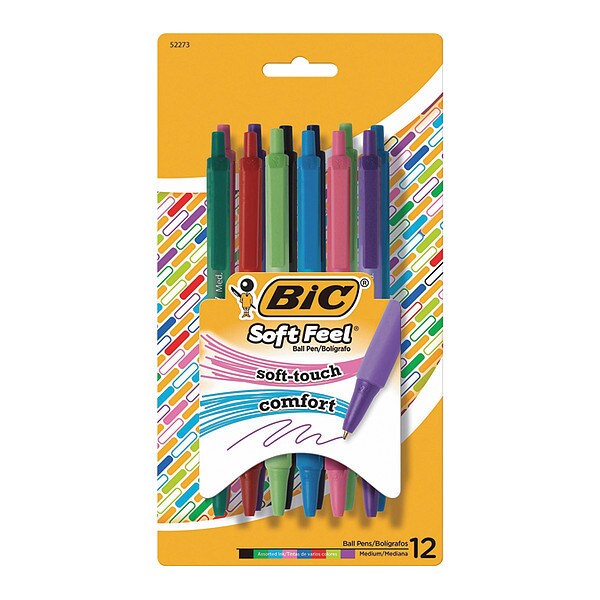 BIC Soft Feel Ball Pen - Medium Point Type - 1 mm Point Size - Assorted - 12 / Pack - Soft Feel Ball Pen features a nonslip grip and soft barrel for the ultimate in writing comfort. Convenient, click-action design eliminates the hassle of requiring a separate cap and allows quick, simple storage. 1.0mm tip produces clean, medium-size lines for dark and legible handwriting. Retractable pen is perfect for everyday writing needs at home, school, the office and more.