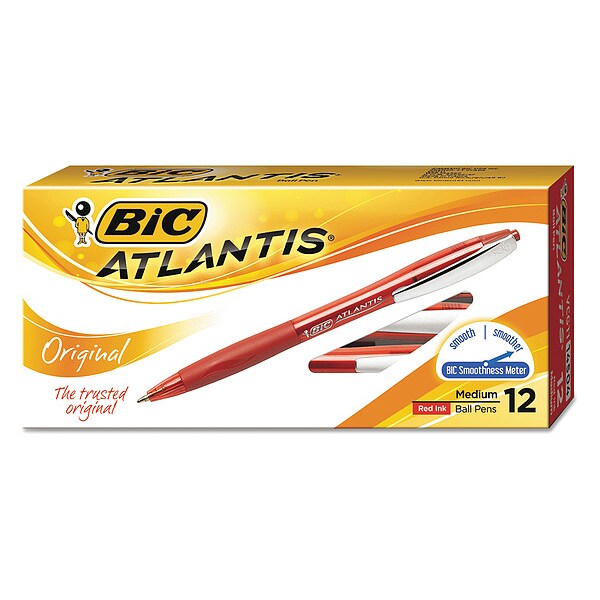 Ballpoint Pen, Pen Tip 1 mm, Barrel Material Plastic, Barrel Color Red, Pen Grip Contoured Cushion, Pen Cap Retractable, Includes Pen Cushion Cushion Included, Pen Ink Color Red, Series Atlantis(R), Package Quantity 12