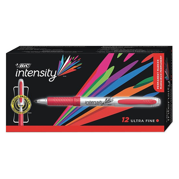 Permanent Marker, Red, Marker Tip Ultra Fine, Marker Cap Capped, Barrel Type Original, Washable No, Waterproof Yes, Markers Brand BIC, Package Quantity 12