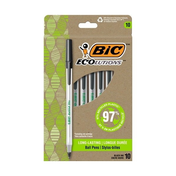 Join the ReVolution and help write our planet's future with the long-lasting, ReVolution Round Stic Ballpoint Pen. Made with recycled plastic, this pen writes longer with a smooth-flow ink system that delivers hours of effortless writing. Multipurpose, medium, 1.0mm tip makes it the perfect everyday writing pen for note-taking, doodling and drawing. Sleek, semi-clear barrel is a handy window for checking ink levels. The paperboard used in this packaging is made of recycled content.