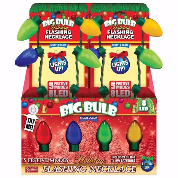 This 8 LED big bulb necklace will make you the life of any party. With its lightweight design it makes it comfortable to wear and the three flashing modes make you stand out from the rest. Give them to your friends and family for any holiday party.
