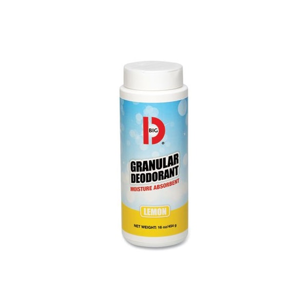 BIG D GRANULAR DEODORANT destroys odors and absorbs moisture in one operation. Designed to be sprinkled on and vacuumed or swept away, it is excellent for garbage cans, dumpsters, pet shops and kennels. The dried clay which forms the base of GRANULAR DEODORANT absorbs moisture rapidly, and the BIG D deodorant in it destroys all odors on contact. Designed to be used on areas affected by vomit, feces, wet garbage, oils and more. GRANULAR DEODORANT may be mixed with sand in smoking stands, or used as cat litter. Clay Base. Scent: Lemon; Physical Form: Powder; Application: Odor Control; Capacity Weight: 16 oz.