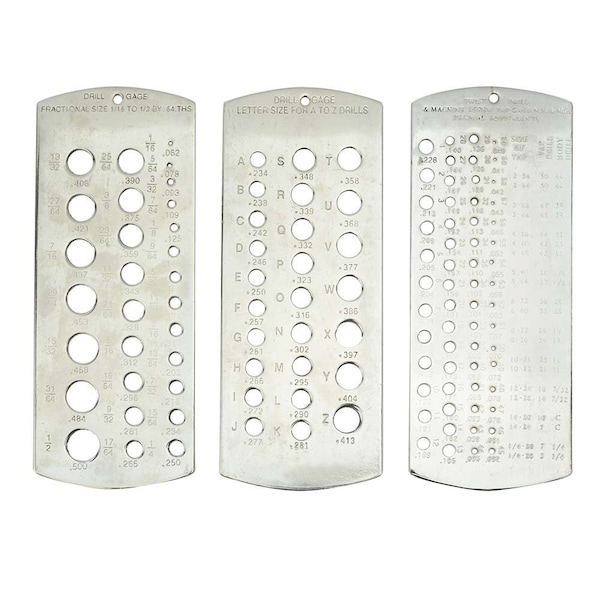 Get organized with this 3 piece drill gauge set. These steel plates have clear markings, precision stamped gauge holes and lists numbered (1-60), lettered (A-Z) and fractional (1/16-Inch-1/2-Inch by 1/64-Inch) sized drill bits. Stop guessing and check those drill sizes before you drill that hole. Even includes a tap drill/clearance drill reference chart.