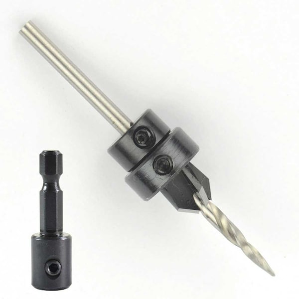 Big Horn 18906 #6 Countersink with Taper Drill from W. L. Fuller # C5M. Universal 1/4-inch quick-change hex shank prevents slipping in standard chucks and is compatible with all 1/4-inch quick-change chucks, including impact drills; Suitable for drilling holes on board of low hardness such as wood, plastic and other soft material. Drilling length can be adjusted for various length screws simply by loosening and Tightening the set screw.