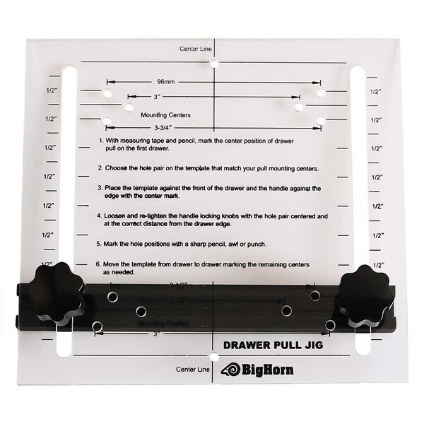 Big Horn 19650 Drawer Pull Jig. Precisely mark position for drawer pulls Mark center line, choose boring width needed and position wooden guide for correct spacing and lock. Align jig over center line & mark holes. Remove jig and drill. Jig measures 7" wide by 6" tall.