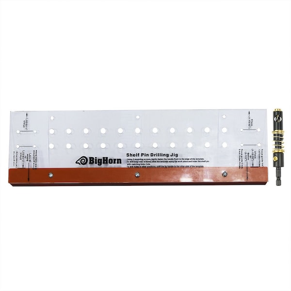 Our Shelving Jig is an easy-to-use, see-through template for drilling consistently spaced and centered shelf-pin holes. This Shelving Jig works with four different bit sizes to quickly and easily drill shelf-pin holes in a wide variety of projects.Big Horn Shelving Jig helps eliminate the hassle of trying to drill correctly spaced pin holes on your own. For use with assembled or unassembled cabinetry that features faceless or face-frame construction, the Shelving Jig is the ideal tool for building bookcases, entertainment centers, or cabinetry with adjustable shelves, or for adding shelves to existing units. The clear template features laser-cut accuracy for consistently spaced, and centered, shelf-pin holes.