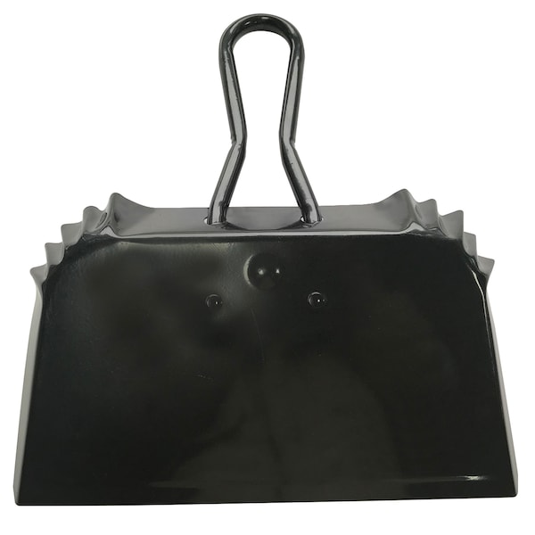This metal dust pan is extra wide and made of industrial stainless steel. It features an 8 inch handle great for hanging up and grabbing for quick clean-ups.