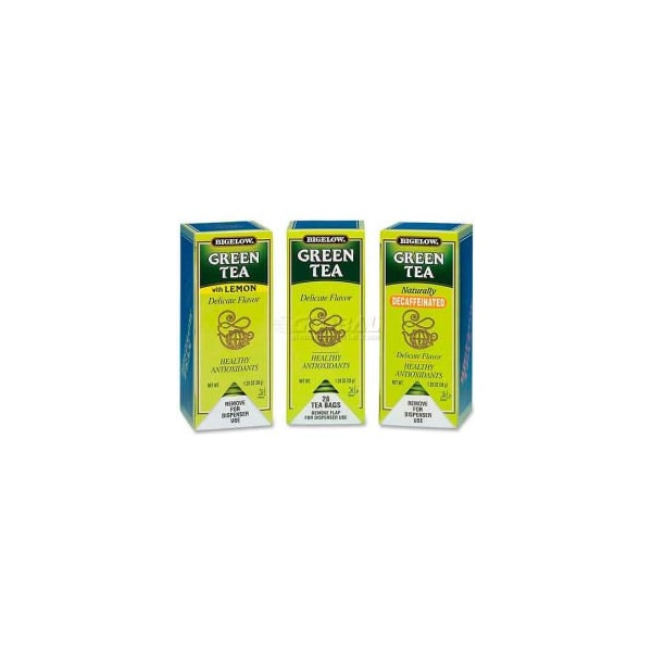 Bigelow green tea bags, assorted bigelow assortment includes bags of the following teas: green tea, green tea with lemon and green tea decaf. Individually packaged tea bags come in self-dispensing boxes.