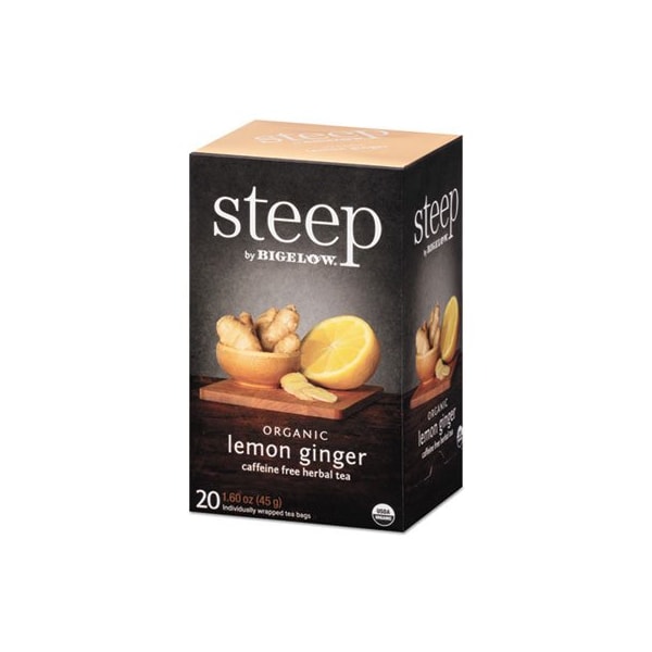 Don't settle for boring teaBigelow steep teas creatively blend exotic, on-trend ingredients in unexpected and uniquely flavorful ways. All natural, organic teas. Non GMO. Part of a fair trade, ethical tea partnership. Organic Lemon GingerSpicy ginger root and zesty citrus combine for a flavorful cup of caffeine free herbal tea. Beverage Type: Tea; Flavor: Lemon Ginger; Packing Type: Tea Bag; Capacity Weight: 1.6 oz.