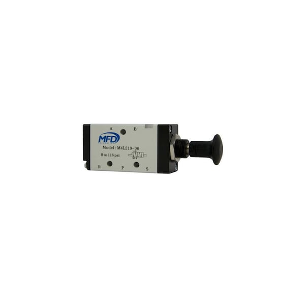 Bimba-mead push-pull valve m4l210-06, 5 port, 2 pos, 1/8" npt m4l210-06 push-pull direct acting valves are 4-way, 1/8 in npt port, spool style valve, provide a 2-position, manual return operation. The m4l210-06 is a manual operation stand alone valve with smooth actuation and reliable orientation. The valve can be body or panel mount.