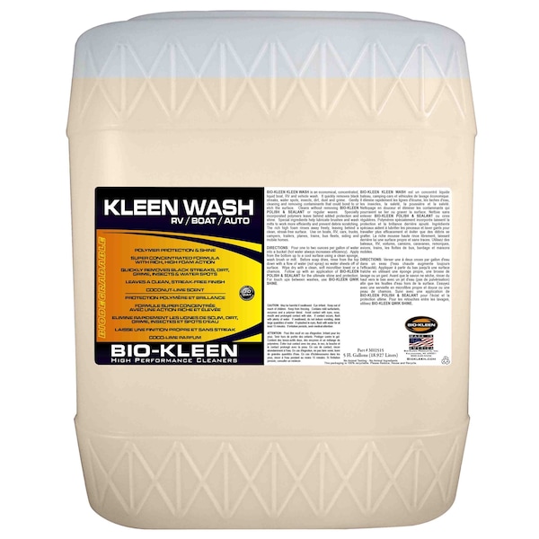 Bio-Kleen Kleen Wash is an economical, concentrated, liquid Boat, RV, Vehicle and Powersports Wash. The unique formulation quickly removes black streak, water sports, insects, dirt, dust and grime. Guards against ozone, ultraviolet rays and destruction with a 40 SPF. Cleans and removes contaminants that could bond to or etch the surface; without removing Bio-Kleen Polish and Sealant or regular waxes. Fortified with polymers leaving behind added protection and shine. Special ingredients help lubricate brushes and wash mitts to work more efficiently and prevent debris scratching. The rich long lasting high foam rinses away freely, leaving behind a clean, streak-free surface. Use on boats, RV, cars, trucks, campers, powersports vehicles, trailers, planes, trains, bus fleets, siding and mobile homes.