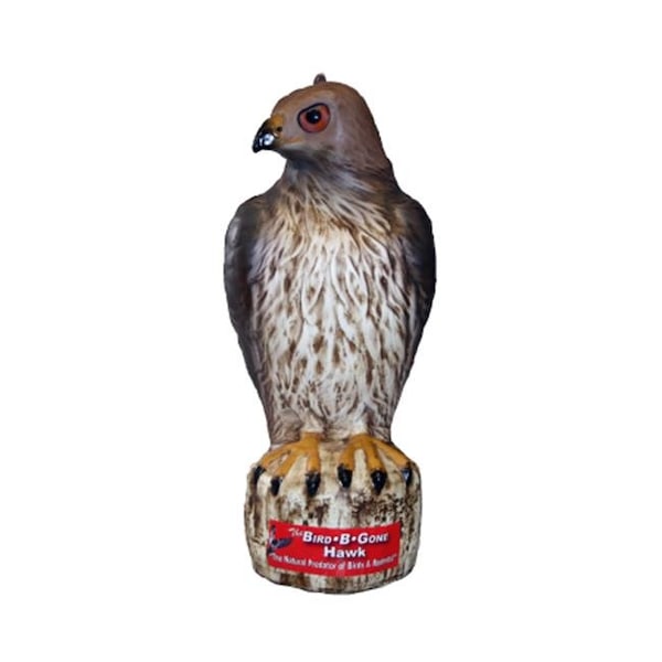 Decoy used to scare pest birds away from balconies, gardens, fruit trees, buildings and other areas where birds or rodents have become a problem. Birds will avoid areas near the decoy, and move on to a more secure spot. Hawks hunt during the day, while most owls’ hunt at night – this makes hawks’ a more identifiable predator to birds. The Bird-B-Gone Hawk is the first Red Tailed Hawk Decoy available in today’s market.
