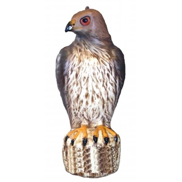Bird-B-Gone Hawk is a scarecrow decoy that looks just like a real hawk: Large orange eyes tilted head and hand-painted body details. The thick base lets the predator bird hawk stand a little taller to scare away garden pests like birds rodents squirrels rabbits etc.