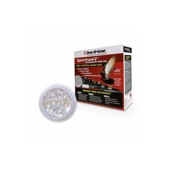 SpectrumV Holographic Bird Gel is an easy economical and effective sensory bird control solution. Each easy-to-apply disc contains an innovative gel that uses a combination of sight sense and smell that repels birds keeping them away from edges ledges and more! SpectrumV Holographic Bird Gel is used to deter sparrows pigeons gulls crows starlings woodpeckers and other bird species from buildings and structures. Sight - Holographic reflection technology creates visual hot spots that scares birds away. Sense - when touched birds do not like the sticky sensation on their feet encouraging them to leave the area. Smell - proprietary blend of ingredients creates an aroma that is unpleasant to birds making this an instinctive bird repellent gel.