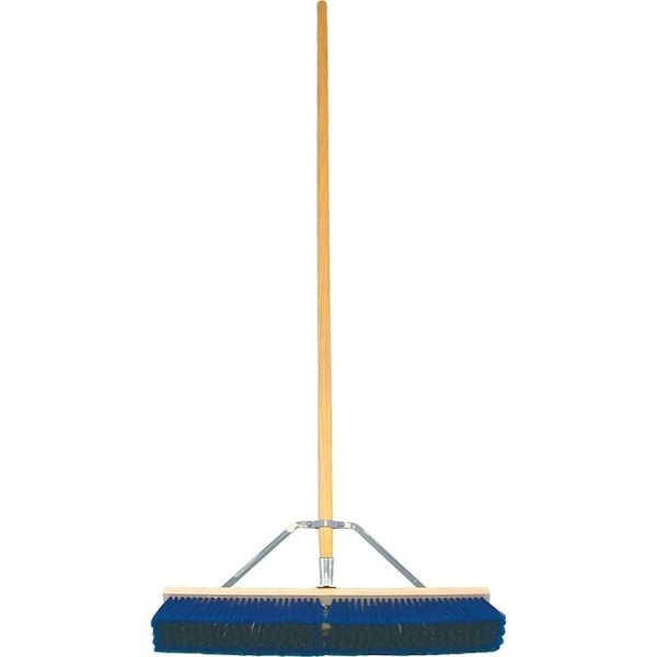 Medium sweeping Border bristle made of blue flagged polypropylene and polystyrene mix solventresistant fiber Center bristle made of stiff black polystyrene solventresistant fiber hardwood block Slotted on 60 in x 118 in hardwood handle with steel brace Fully assembled Reverse the handle and brace