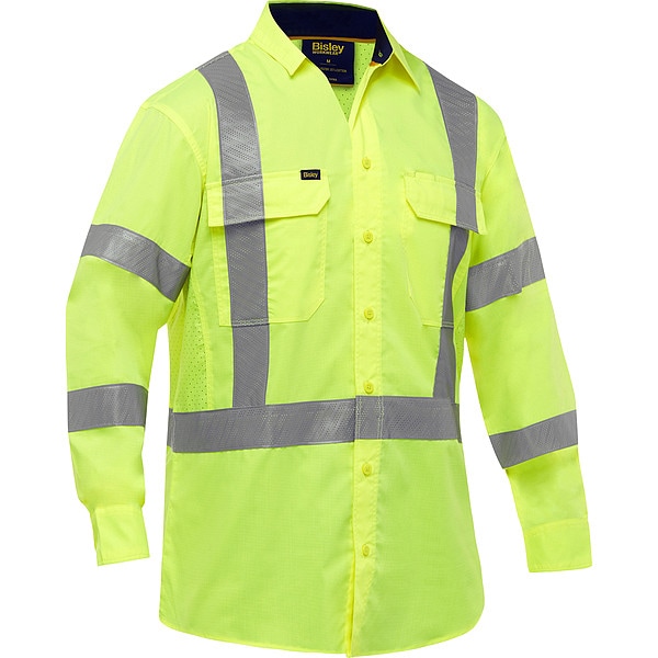 High-Visibility Shirt, Gender Men's, ANSI Class 3, Shirt Style Work Shirt, Back Stripe Pattern X, Material Cotton, Polyester, Number of Outside Pockets 2, Front Closure Type Buttons, Collar Style Two-Piece Structured, Color Yellow, Size 2XL, Size-Body Type Regular, Fabric Weight Not Applicable, Reflective Tape Type Prismatic, Reflective Stripe Border Type None, Garment Features Sweat-wicking, Standards ANSI, CSA Z96, Sleeve Type Long, Maximum Chest Size 47 1/2 in, ANSI Type R