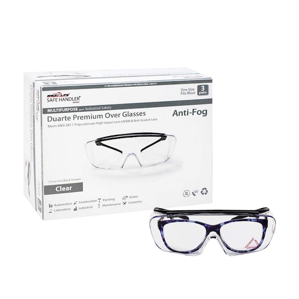 SAFE HANDLER brand by Bison Life, Duarte Premium Clear Lens Black Temple, Anti-Fog & Anti-Scratch Safety Glasses Built for comfort: Fits most head sizes comfortably without slipping, while providing all-out protection against industrial hazards. These glasses are built with durable Poly-carbonate construction and boast a shatter-proof and high-impact lens, your safety will always come first. Over glasses fit works with and without prescription glasses. Simply slip on over glasses so that you can see clearly in any situation with a snug and comfortable fit. The ultra-lightweight design encourages less slippage and a dependable fit reducing hazards from reaching your eyes.