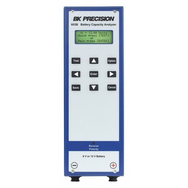 Battery Capacity Analyzer, Works With 6/12V Lead Acid Batteries, Measures Resistance, Terminal Voltage, Max. Input Volts 30VDC, Accuracy +/-0.2 Percent +/-10 mV, Powered By Battery Under Test, LCD Display, Includes (2) Alligator Test Leads, USB Type B Cable, Adapter, Test Report, Calibration Certificate, Manufacturers Warranty Length 1 yr.