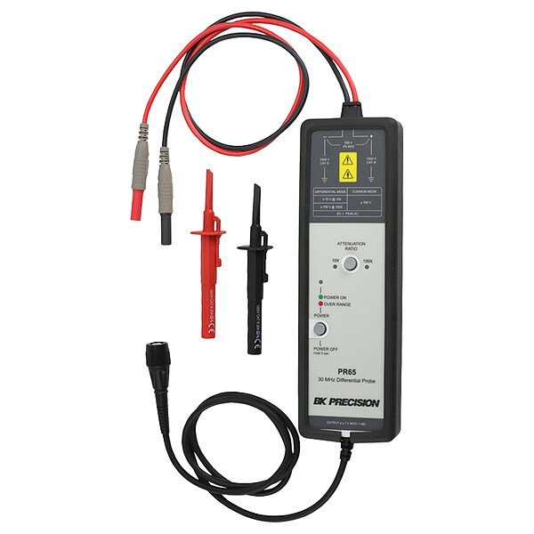 Oscilloscope Probe, Bandwidth (MHz) 30 MHz, Cable Length (Meters) 37.4 in, Input Impedance (Ohms) 5 megaohm, Capacitance (pF) 2 pF, Approx. Rise Time (ns) 14 nsec, Max. Voltage 700V, Safety Rating 1,000 V CAT III, Includes EU Plug Converter, Insulated Sprung Hook Probes, Power Adapter, Protective Case
