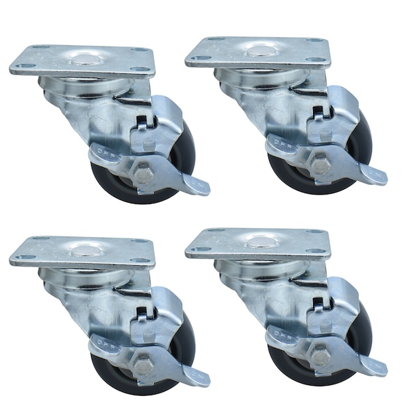 3-inch Plate Casters, Gray Rubber Wheels, Top Lock Brake, 250lb Capacity, 4PK