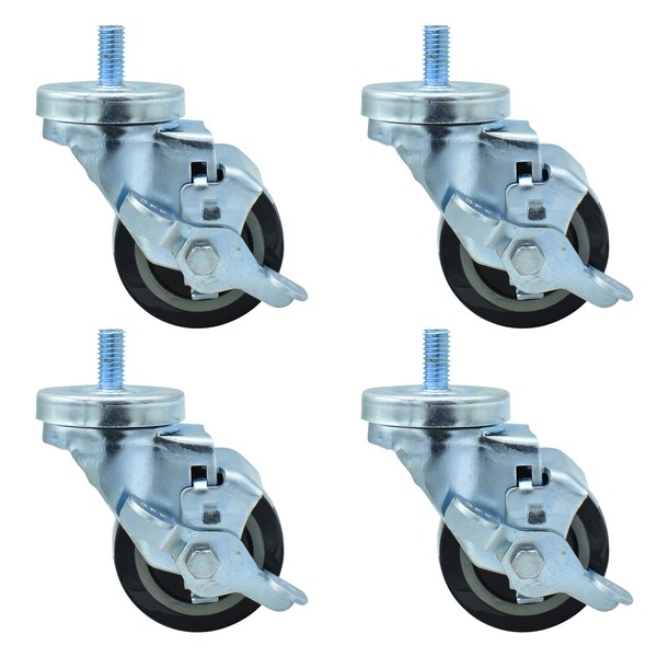 3-inch Threaded Stem Casters, Polyurethane Wheels, Brake, 300lb Capacity, Acid Resistant, 4PK