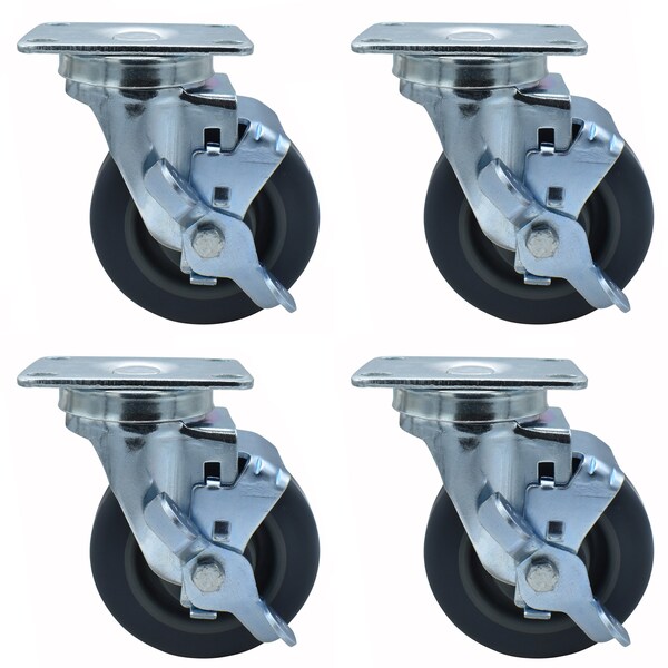 4-inch Plate Casters, Gray Rubber Wheels, Top Lock Brake, 250lb Capacity, 4PK