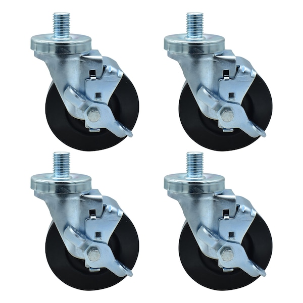 4-inch Threaded Stem Casters, Hard Rubber Wheels, Brake, 300lb Cap, Grease/Water Resistant, 4PK