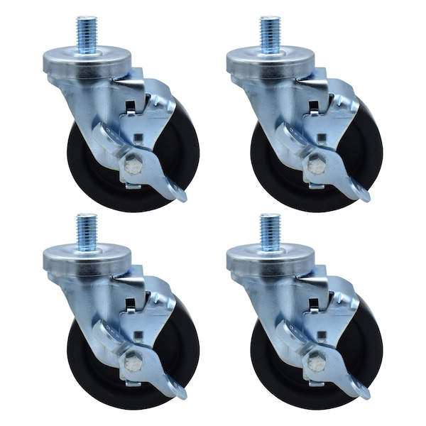 4-inch Threaded Stem Casters, Polyolefin Wheels, Top Lock Brake, 300lb Capacity, 4PK