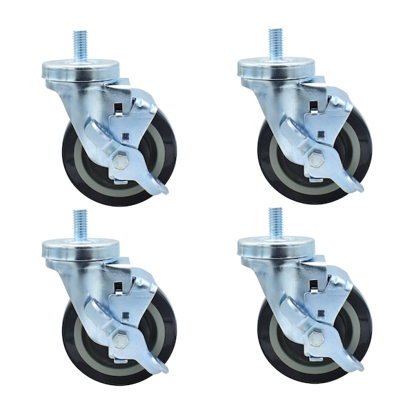 4-inch Threaded Stem Casters, Polyurethane Wheels, Brake, 300lb Capacity, Acid Resistant, 4PK