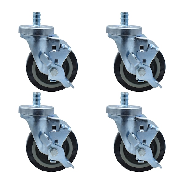 4-inch Threaded Stem Casters, Polyurethane Wheels, Brake, 300lb Capacity, Acid Resistant, 4PK