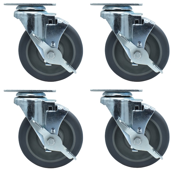 5-inch Plate Casters, Gray Rubber Wheels, Top Lock Brake, 250lb Capacity, 4PK