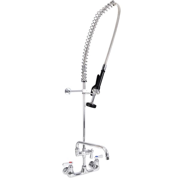 Optiflow Pre-Rinse Assembly with 8" O.C. Splash Mount and 8" add-on faucet. Includes 44" Stainless Steel Braided Hose (Triple-Ply @300 Psi), 12" Wall Bracket, Integral Check Valves,1/2" Female Inlets, 1/4 Turn Ceramic Valves. Assembly is Lead Free, ANSI/NSF 61.