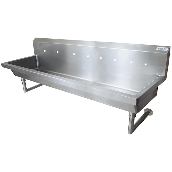 96" Wall Mount Four Station Handwash Sink with 8" O.C. Splash Mount. Sink is made from 14 gauge T-304 stainless seel with 18 gauge stainless steel legs and supports. Includes T-304 Basket Drain. Tested and certified by NSF. This product has a 3-5 day lead time.