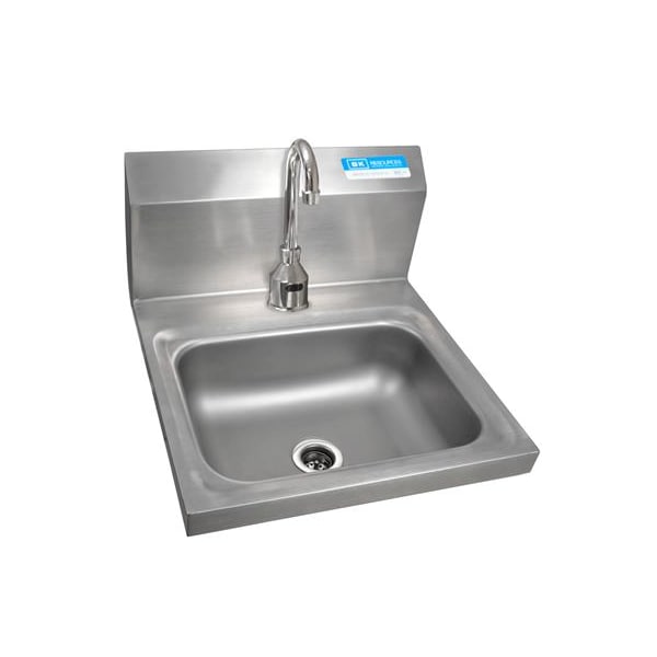 BK Resources wall-mount sink, the Perfect 304 stainless-steel Hand sink With Electronic Sensor Faucet for use in a kitchen, bar, restaurant, laundry, school, hospital or any other commercial setting, 13-3/4"W x 10"D x 5" Deep bowl Size, 1-7/8" Basket Drain With Crumb Cup, Single Hole Deck Mount, Wall Bracket Included, NSF