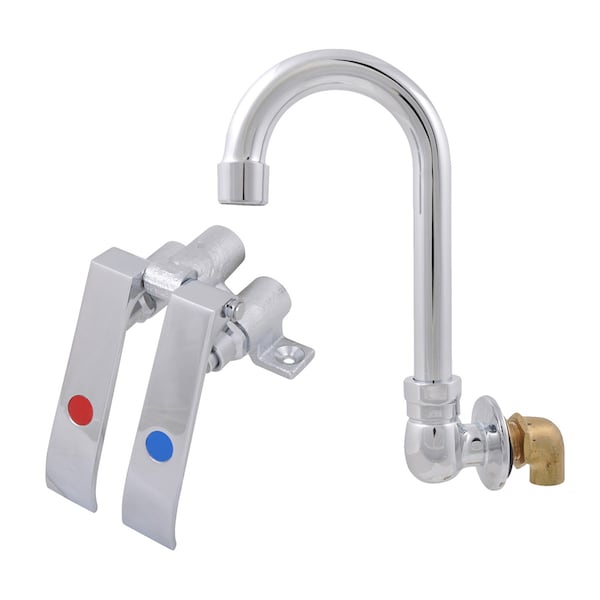 Chrome Plated Knee Valve Assembly with Splash Mount. 3-1/2" Gooseneck Swivel Spout has 1/2" NPS Threading and O.C. Dual Pedals. Lead Free, ANSI/NSF 61, cCSAus