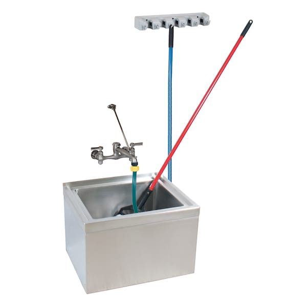 Mop sink kit with floor mount measures 16" Widex20" Front-To-Backx6" Deep. Kit is made from 18/304 Stainless Steel. Includes: (1) 3-1/2" Heavy Duty Brass Basket Drain (BKdr-Hd4), (1) 48" Service Faucet Hose (BK-Sfh-48), (3) Skirted Sides, (1) Service Faucet With Vacuum Breaker (BKSF-WB1), 5-Slot Utility Tool Holder & (6) Plastic Hooks (BK-UTH-5)