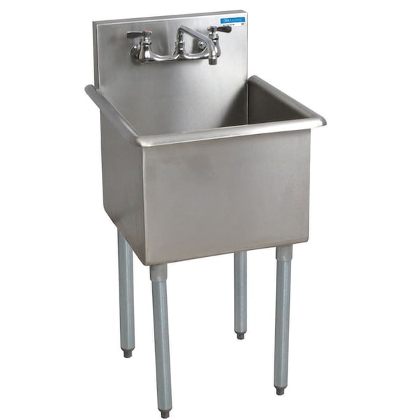 One compartment budget sink measures 27"Wx27-1/2"Dx41"H with 24"x24"x14" deep compartments and 8" O.C. splash mount faucet holes. The deck and bowls are made from 18 gauge stainless steel with square corners and 1-1/2" rounded front and side edges. Sink includes basket drain. 8" backsplash prevents hard to clean messes. Legs are made from galvanized steel. High impact corrosion resistant feet are adjustable. Tested and certified by NSF.