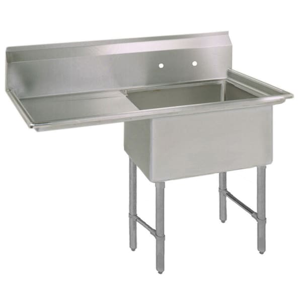 One compartment sink measures 50"Wx29-13/16"D with 24"x24"x14" deep compartments. The deck and bowls are made from T-304 16 gauge stainless steel. Sink has stainless steel bracing for stability. There is a 24" drainboard on the left side and the 1-1/2" front and side edges are rolled. Sink includes basket drain and accomodates 8" on center faucets. 9" backsplash prevents hard to clean messes. Legs are made from galvanized steel. Plastic bullet feet are adjustable. Tested and certified by NSF.