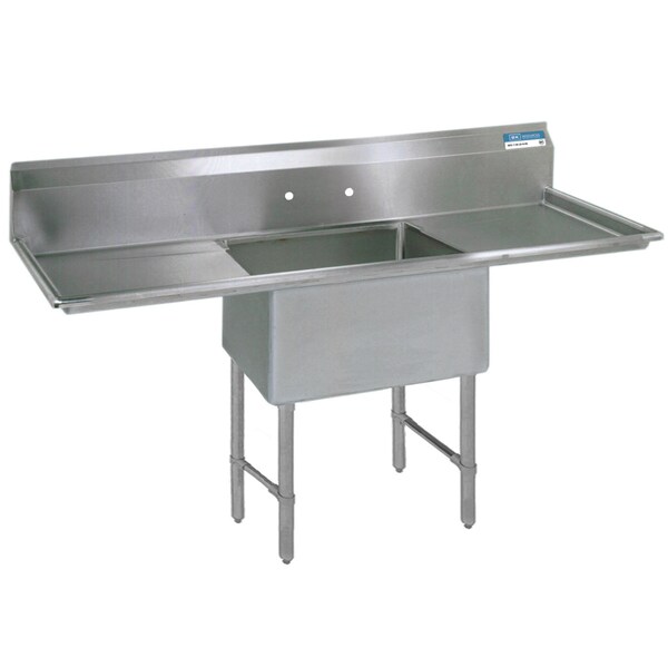 One compartment sink measures 72"Wx29-13/16"D with 24"x24"x14" deep compartments. The deck and bowls are made from T-304 16 gauge stainless steel. Sink has stainless steel bracing for stability. There is a 24" drainboard on the left and right sides and the 1-1/2" front and side edges are rolled. Sink includes basket drain and accomodates 8" on center faucets. 9" backsplash prevents hard to clean messes. Legs are made from galvanized steel. Plastic bullet feet are adjustable. Tested and certified by NSF.