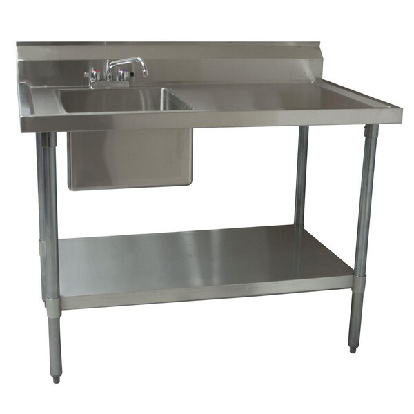 This prep table measures 60"W x 30"D. The top is made from 18/304 stainless steel. The sink bowl measures 16"W x 20"D x 10" H and is set on the left side of the table to leave some free work space. The 6" backsplash prevents hard to clean messes. This table includes 4" O.C. Deck Mount Faucet holes and a basket drain. The legs and adjustable undershelf are made from stainless steel. The stainless steel bullet feet are adjustable. This table is tested and certified by NSF.
