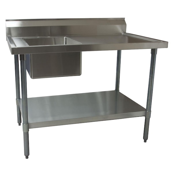 This prep table measures 60"W x 30"D. The top is made from 18/304 stainless steel. The sink bowl measures 16"W x 20"D x 10" H and is set on the left side of the table to leave some free work space. The 6" backsplash prevents hard to clean messes. This table includes 4" O.C. Deck Mount Faucet holes and a basket drain. The legs and adjustable undershelf are made from stainless steel. The stainless steel bullet feet are adjustable. This table is tested and certified by NSF.