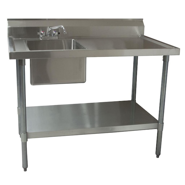 This prep table measures 72"W x 30"D. The top is made from 18/304 stainless steel. The sink bowl measures 16"W x 20"D x 10" H and is set on the left side of the table to leave some free work space. The 6" backsplash prevents hard to clean messes. This table includes 4" O.C. Deck Mount Faucet holes and a basket drain. The legs and adjustable undershelf are made from stainless steel. The stainless steel bullet feet are adjustable. This table is tested and certified by NSF.
