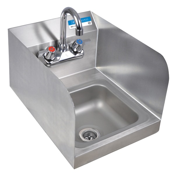 BK Resources wall-mount sink, the Perfect 304 Stainless Steel Space Saver Hand Sink With Side Splashes for use in a kitchen, bar, restaurant, laundry, school, hospital, hotel, park, or any other commercial setting, 9" Wide X 9" Front-To-Back Bowl, 4" O.C. Splash Mount Faucet Holes With Workforce Splash Mount Faucet W/3.5" Gooseneck Spout, 1-7/8" Drain Opening, Basket Drain & Mounting Bracket Included, NSF